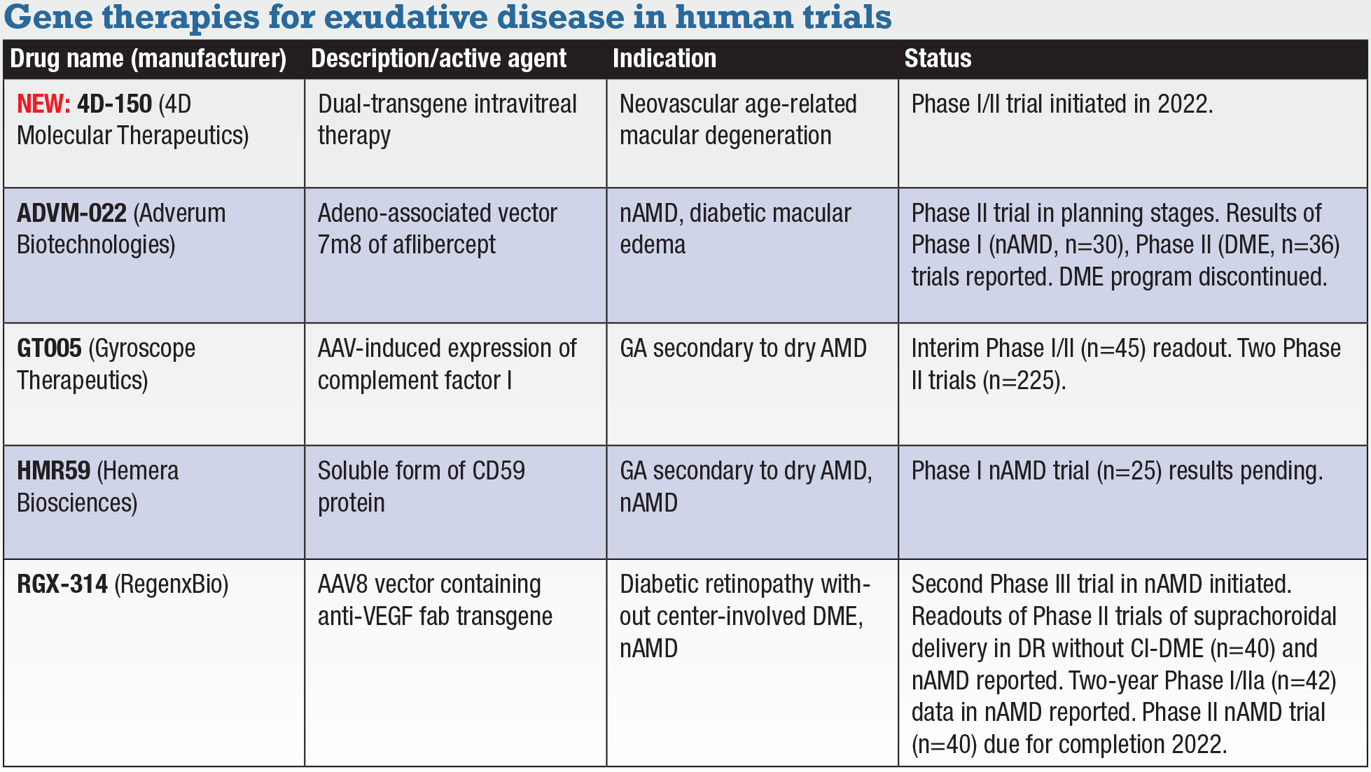 Gene therapies targeting GA, nAMD, DR NEW: 4D-150 (4D Molecular Therapeutics). 4D reports dosing the first patient in the Phase I/II trial evaluating this dual-transgene, intravitreal therapy in patients with neovascular age-related macular degeneration. The dose-escalation, randomized, controlled, masked expansion trial is expected to enroll about 60 adults. It will involve multiple dose levels in an open- ADVM-022 (Adverum Biotechnologies). Adverum reports it’s finalizing the design of a Phase II trial in nAMD that will evaluate two doses of ADVM-022: a 2 x 1011 vg/eye dose and a lower 6 x 1011 vg/eye dose. ADVM-022 is a single intravitreal injection treatment that uses a proprietary adeno-associated vector capsid, AAV.7m8, carrying an aflibercept-coding sequence under the control of a proprietary expression cassette. The nAMD trial will include three new enhanced steroid prophylaxis regimens, possibly a topical, intravitreal and a combination of systemic and local steroids. The trial is expected to enroll approximately 72 patients, with enrollment starting in the third quarter. Data from the Phase I OPTIC trial in nAMD (n=30, NCT03748784) demonstrated a >80-percent reduction in yearly anti-VEGF injections following the 2E11 dose.17 The Phase II INFINITY trial in DME (n=36, NCT04418427) reported higher-than-expected rates of intraocular inflammation and iris-related events,18 so the company discontinued the diabetic macular edema program. GT005 (Gyroscope Therapeutics). A one-time therapy delivered subretinally, GT005 aims to induce complement factor I expression. Interim data from the Phase I/II FOCUS trial (n=45, NCT03846193) in GA reported no treatment-related serious adverse events in 28 patients, while biomarker data from 13 patients demonstrated sustained increased levels of vitreous complement factor I (CFI) as well as sustained decreases in downstream proteins associated with complement system activation.19 A new analysis showed no increases in systemic CFI levels circulating in the blood. Completion of the trial is planned in 2025. Two other trials are ongoing: Phase II EXPLORE trial (n=75, NCT04437368) evaluating two doses administered as a single injection in GA, due for completion in early 2023; and Phase II HORIZON (n=150, NCT04566445), also evaluating two doses in one injection in GA, with completion scheduled for early next year. HMR59 (Hemera Biosciences). Results are pending from the HMR-1002 Phase I proof-of-concept study (n=25, NCT03585556) in treatment-naïve patients with new onset nAMD. HMR59 is a soluble form of CD59, the protective protein normally found on the cellular plasma membrane. Patients receive a single intravitreal injection of HMR59 a week after getting an anti-VEGF treatment. They’re being followed for 12 months and treated with additional anti-VEGF monthly as needed. RGX-314 (RegenxBio). RegenxBio has initiated the ASCENT trial, the second Phase III trial evaluating RGX-314 in nAMD. ASCENT is evaluating subretinal delivery across two dose arms—6.4 x 1010 genomic copies per eye (GC/eye) and 1.3 x 1011 GC/eye—vs. aflibercept. The primary endpoint is noninferiority to aflibercept-based BCVA change at one year. The trial will enroll around 465 patients. RGX-314 is an AAV8 vector that contains a transgene for anti-VEGF fab. Two Phase II trials of suprachoroidal delivery are also ongoing: AAVIATE in nAMD (n=40, NCT04514653) and ALTITUDE in diabetic retinopathy without center-involved DME (n=40, NCT04567550). In AAVIATE, RGX-314-treated patients had an average six-month change in central retinal thickness of -33 µm compared to -12 µm for the ranibizumab group. RGX-314 patients also showed a 71.8-percent reduction in anti-VEGF treatment burden at six months.19 Two-year results of a Phase I/IIa trial of subretinal delivery of RGX-314 in nAMD (n=42, NCT03066258) demonstrated the treatment was generally well tolerated across five dose cohorts with long-term durability out to three years.20 In ALTITUDE, 15 patients dosed with 2.5 x 1011 GC/eye of RGX-314 demonstrated stable BCVA of +2.6 letters, while five patients in the observational control arm demonstrated stable BCVA of -0.4 letters.19 Five patients (33 percent) demonstrated a two-step or greater improvement in VA vs. none in the control group.21 Enrollment started at the beginning of the year in the pivotal Phase IIb/III ATMOSPHERE study (n=300, NCT040704921) comparing RGX-314 and ranibizumab in patients with nAMD. Completion is expected in 2024.