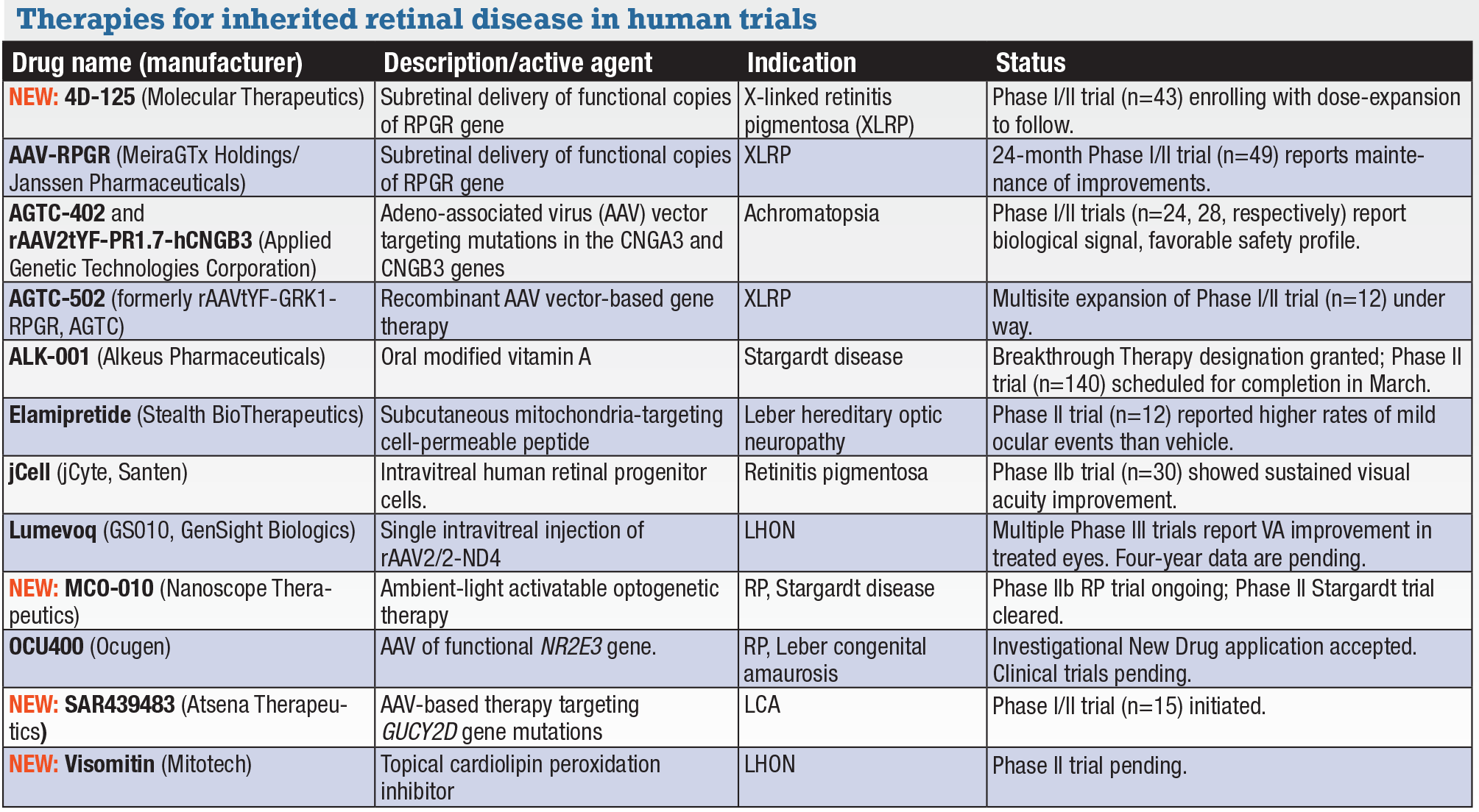 Investigational therapies for inherited retinal disease There’s also one name change: AGTC-501 (Applied Genetic Technologies Corporation) was listed as rAAV2tYF-GRK1-RPGR last year. NEW: 4D-125 (4D Molecular Therapeutics). The Food and Drug Administration granted Fast Track designation to this candidate for retinal dystrophies due to defects in the RPGR gene, including XLRP. 4D-125 aims to deliver a functional copy of the RPGR gene (retinitis pigmentosa GTPase regulator) to photoreceptors. 4DMT is currently enrolling patients in a Phase I/II clinical trial (n=43, NCT04517149). The study is using a standard 3+3 dose-escalation design, followed by dose expansion. AAV-RPGR (MeiraGTx Holdings/Janssen Pharmaceuticals). This recombinant AAV vector aims to deliver functional copies of the RPGR gene to the subretinal space. In the dose-escalation phase of a Phase I/II clinical trial (n=49, NCT03252847) in XLRP, patients treated with AAV5-RPGR gene therapy demonstrated changes in mean retinal sensitivity and volumetric analysis of the central 30 degrees of the retina that were maintained at 24 months.22 A follow-up study (n=36, NCT04312672) is evaluating long-term safety of the AAV2-RPGR vector. AGTC-402, rAAV2tYF-PR1.7-hCNGB3 and AGTC-501 (formerly rAAV2tYF-GRK1-RPGR) (Applied Genetic Technologies Corporation). AGTC presented 12-month findings of two Phase I/II trials of gene therapies in achromatopsia: AGTC-402 for mutations in the CNGA3 gene (n=24, NCT02935517); and rAAV2tYF-PR1.7-hCNGB3 for mutations in the CNGB3 gene (n=28, NCT02599922).23 The agents demonstrated biologic activity based on improvements in visual sensitivity and light discomfort, along with a favorable safety profile. Three-month data from pediatric patients in both trials are due in the fourth quarter and an end-of-Phase II briefing packet to the FDA in the first half of 2022. Meanwhile, AGTC reports it enrolled 14 patients in the SKYLINE trial of AGTC-501, a recombinant adeno-associated virus vector-based gene therapy for XLRP, exceeding the planned target enrollment of 12. SKYLINE is a multi-site expansion of the ongoing Phase I/II study (n=42, NCT03316560). The goal is to identify the proportion of treated eyes that show improvement in visual sensitivity and acuity, as well as functional outcomes. ALK-001 (Alkeus Pharmaceuticals). The FDA granted Breakthrough Therapy designation to ALK-001, an oral modified form of vitamin A, for Stargardt disease. A Phase II placebo-control study (n=140, NCT02402660) is recruiting patients. ALK-001 is designed to replace vitamin A and prevent formation of toxic vitamin A dimers that have been linked to vision loss. The trial is scheduled for completion in March. Elamipretide (Stealth BioTherapeutics). Phase II results in LHON (n=12, NCT02693119) showed that two of 16 treated eyes had visual impairment and higher rates of mild ocular surface problems than vehicle. Six treated eyes also had mild cataract, as did five vehicle-treated eyes before switching to elamipretide. Elamipretide is a cell-permeable peptide that targets mitochondrial dysfunction and is delivered subcutaneously. jCell (jCyte, Santen). jCell is an intravitreal injection of human retinal progenitor cells (hRPC) into the vitreous that aims to preserve or potentially restore some vision in RP and related conditions. One-year Phase IIb results (n=30, NCT04604899) showed that patients treated with a 6-million cell dose had a sustained average improvement of +16.27 letters vs. +1.85 letters in the sham group (p=0.003).24 A separate analysis found a correlation between improvements in central foveal thickness and visual function.25 The Phase IIb and Phase II trials (n=84, NCT03073733) in RP are ongoing. Lumevoq (GS010, GenSight). The Phase III REFLECT trial (n=98, NCT03293524) in LHON caused by a defect in the ND4 gene demonstrated that 73 percent of bilaterally treated eyes had VA improvement of >15 letters two years after treatment. Lumevoq (lenadogene nolparvovec) is a single intravitreal injection of rAAV2/2-ND4. Three-year data from RESTORE (n=61, NCT03406104), a follow-up trial of the Phase III RESCUE (n=39, NCT02652767) and REVERSE (n=37, NCT02652780) trials, showed sustained VA improvement in treated patients.26 Four-year data are pending. NEW: MCO-010 (Nanoscope Therapeutics). The FDA has approved an Investigational New Drug (IND) application to begin a Phase II trial in Stargardt disease, and a Phase IIb trial in RP is ongoing. MCO-010 is an ambient-light activatable optogenetic monotherapy. OCU400 (Ocugen). The FDA accepted the company’s application for a human clinical trial of OCU400 (AAV-NR2E3), a modifier gene therapy that targets nuclear hormone receptors (NHR). The FDA has granted four orphan drug designations for OCU400, and the European Medicines Agency granted two in 2021 for RP and LCA. Ocugen says the platform could be indicated for multiple IRDs. One potential indication is RP caused by PDE6B mutation autosomal-dominant congenital stationary nyctalopia and resulting from genetic mutations found in NR2E3 and rhodopsin. OCU400 consists of a functional copy of the NR2E3 gene. NEW: SAR439483 (Atsena Therapeutics). Atsena received orphan drug designation for its unnamed investigational AAV-based therapy for LCA caused by biallelic mutations in the GUCY2D gene. The safety and efficacy of the therapy are being evaluated in a Phase I/II clinical trial (n=15, NCT03920007). Study completion is scheduled for February. Atsena is also pursuing human trials for its gene therapy program for X-linked retinoschisis. NEW: Visomitin (Mitotech). The FDA granted orphan drug designation for treatment of LHON. Visomitin is a topical cardiolipin peroxidation inhibitor. Mitotech says it plans this year to start a Phase II trial for the indication, and reports that a three-year open-label Phase IIa study conducted outside the United States showed improvements in a range of underlying mutations.