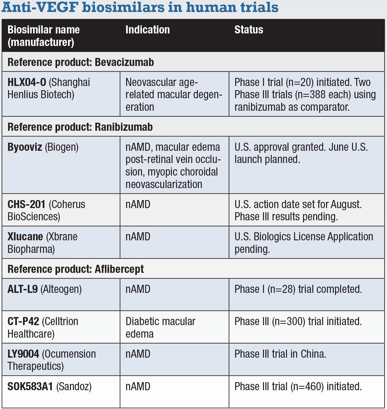 ALT-L9 (Alteogen). South Korea-based Alteogen reported in April that it completed a Phase I comparator trial (n=28, NCT-04058535) that showed equivalent efficacy in nAMD. Alteogen says the findings may provide a path to a shorter Phase III trial. Alteogen is developing ALT-L9 in collaboration with Kissei Pharmaceutical of Japan. CT-P42 (Celltrion Healthcare). Celltrion initiated a Phase III trial in diabetic macular edema (n=300, NCT04739306). LY9004 (Boan Biology). Luye Pharma’s biotech subsidiary has licensed this candidate, also known as OT-702, to Ocumension Therapeutics. It’s in Phase III trials in China, but not in the United States. SOK583A1 (Sandoz). The Novartis division initiated the Phase III MYLIGHT trial (n=460, NCT04864834) comparing this previously unnamed agent with the reference product.