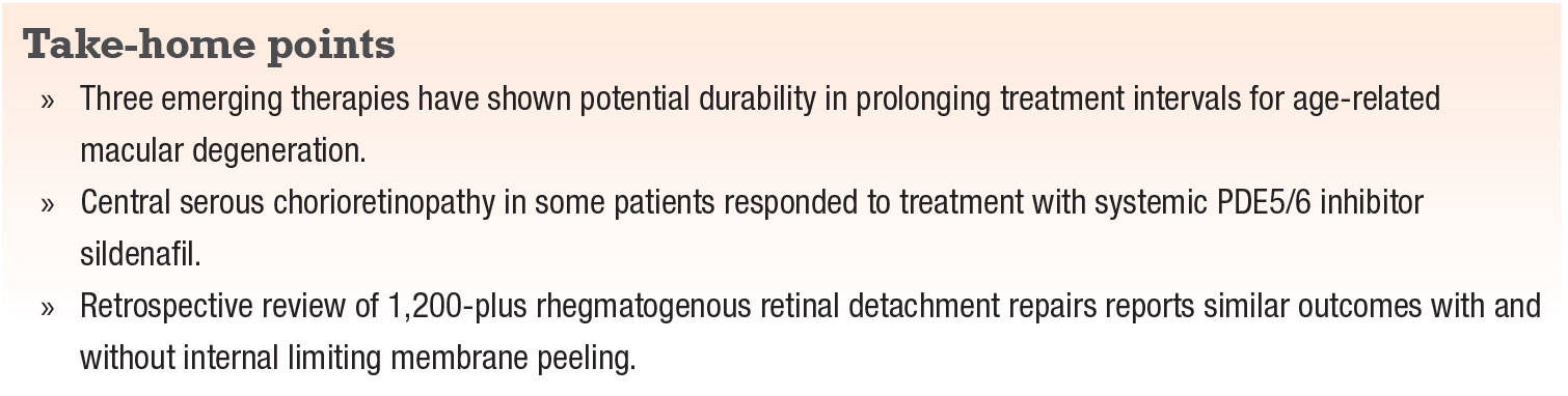 Here, we present our annual selection of five compelling posters and presentations. We begin with three promising therapies designed to significantly reduce the treatment burden for neovascular age-related macular degeneration. The last two abstracts discuss sildenafil as a potential treatment for central serous chorioretinopathy (CSC) and the utility of internal limiting membrane peeling for repair of rhegmatogenous retinal detachments.