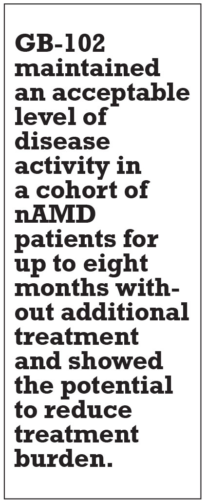 Existing anti-VEGF treatments permit treatment intervals of up to three months in certain patients. GB-102 maintained an acceptable level of disease activity in a cohort of nAMD patients for up to eight months without additional treatment. GB-102 demonstrated potential to reduce treatment burden in nAMD, but further study is warranted.