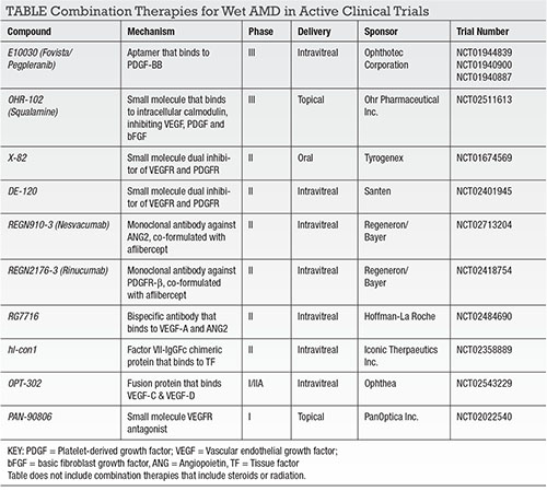 The two major upgrades being investigated with anti-VEGF therapy include drugs that provide predictable, sustained improvement in visual acuity and treatments that result in fewer clinic visits and injections. To address these unmet needs, the next generation of therapies in clinical trials are exploring agents and combinations that should result in better visual acuity and require fewer injections (Table, page 14).