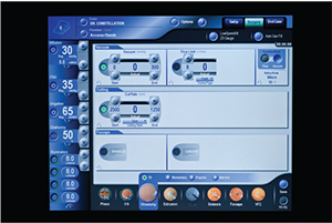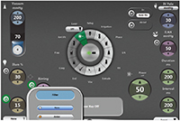 The graphical user interface features a 19-inch touch screen, voice feedback, infrared remote control and five language choices, including English and Spanish. It displays functions on the left side of the screen. We have preset and customized settings, which we can modify and save intraoperatively, such as a scleral depression mode that lowers the IOP to a desired level.