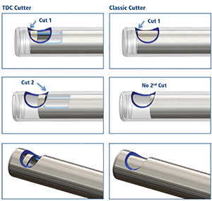 | Figure 1. Comparison of the DORC two-dimensional cutter vs. conventional vitreous cutter. Vitreous enters the inner aperture and is cut in a forward and then backward motion, increasing the amount of cutting in a single motion. |