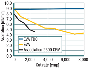 | Figure 2. Aspiration flow rates at varying cut rates for 27-gauge TDC vitrectors (basic salt solution at vacuum rate of 550 mmHg). DORC small-gauge TDC cutters maintain constant flow rates independent of cuts per minute. |