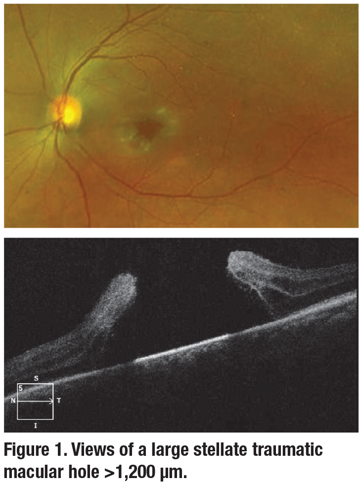 A large traumatic macular hole poses a challenge to the vitreoretinal surgeon, because both characteristics—large and traumatic—are associated with lower surgical closure rates. The mechanism of traumatic macular hole formation is more likely to result in avulsed tissue, and even after vitrectomy with wide internal limiting membrane peel, the hole may not successfully close.