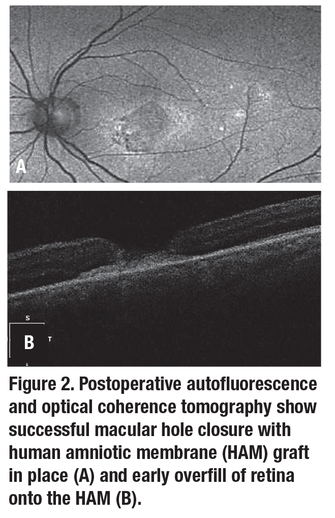 Newer techniques have been developed to address macular holes with lower likelihood of closure. Stanislao Rizzo, MD, and colleagues at the University of Florence in Italy recently reported on a technique that uses human amniotic membrane (HAM) placed in the subretinal space to bridge the tissue gap and provide a scaffold which the surrounding retinal tissue can overfill to successfully close the macular hole.1