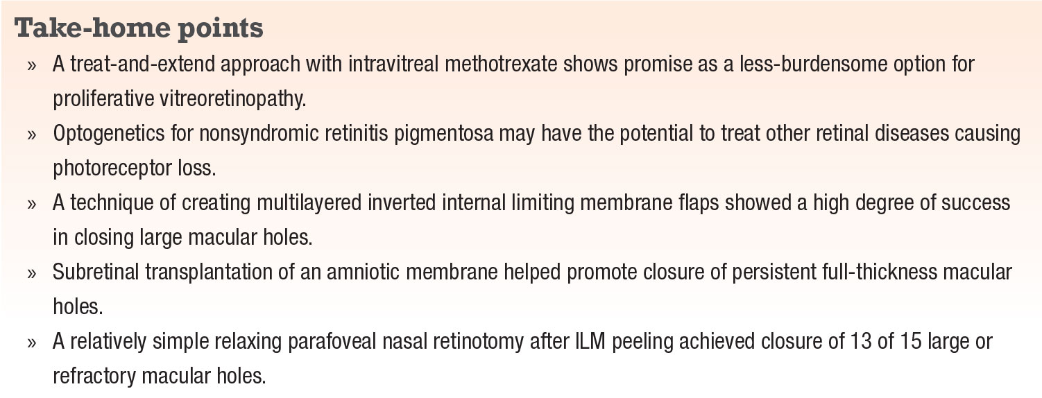 Here, we present five intriguing presentations: management of proliferative vitreoretinopathy (PVR) using intravitreal methotrexate; optogenetics for retinitis pigmentosa; and three novel techniques to close persistent and/or large macular holes.