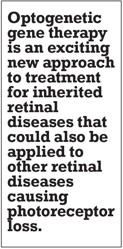 In retinal diseases like RP that result in photoreceptor loss, conferring photosensitivity in retinal ganglion cells may potentially restore vision. Optogenetic gene therapy is “gene agnostic,” meaning that it could theoretically be utilized for any of the mutations causing RP.