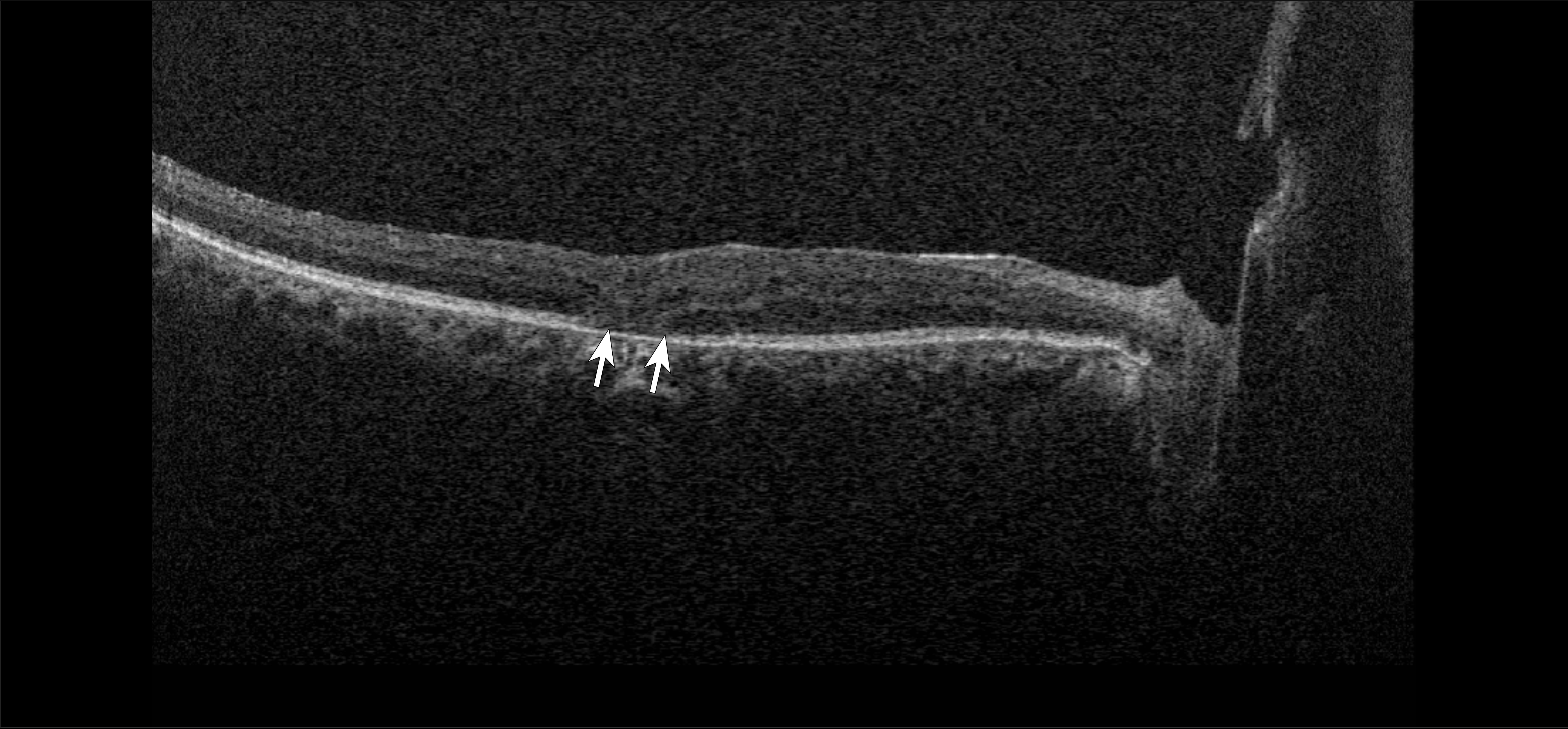 | Figure 2. Optical coherence tomography of a 59-year-old with a history of proliferative diabetic retinopathy demonstrating outer retinal disruption (arrows). |