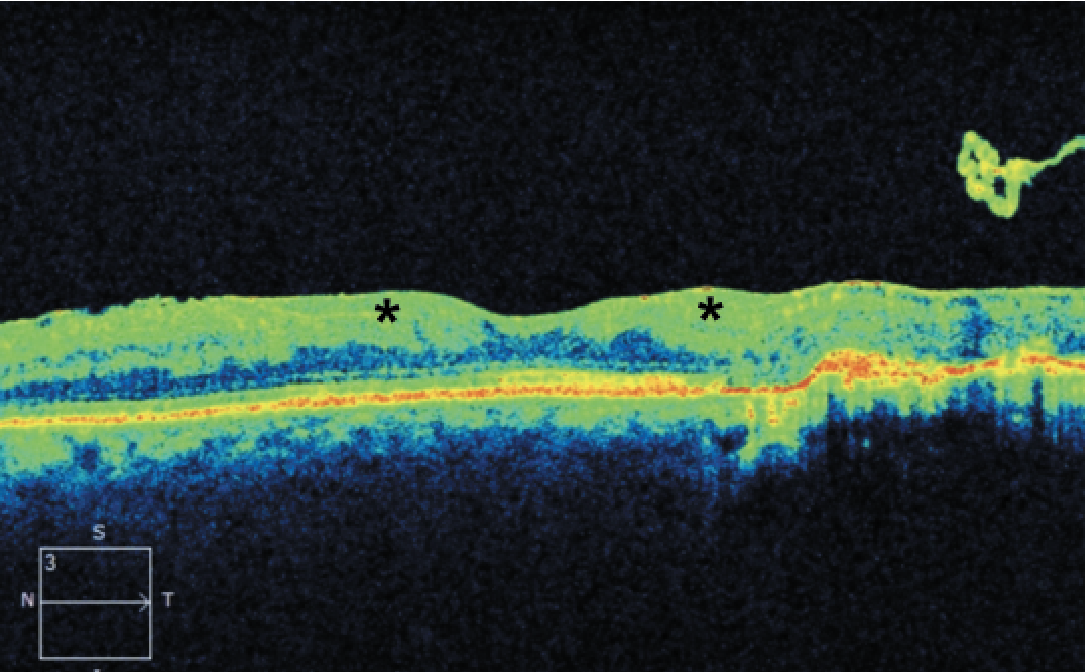 | Figure 1. Optical coherence tomography of a 41-year-old male with a history of proliferative diabetic retinopathy demonstrating disorganization of the retinal inner layers (asterisks). |