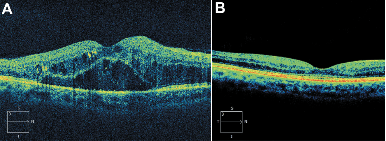 | Figure 3. (A) Optical coherence tomography of a 47-year-old male with a history of nonproliferative diabetic retinopathy demonstrating the presence of subretinal fluid, intraretinal fluid and intraretinal deposits. (B) Optical coherence tomography six years after initiation of regular intravitreal anti-VEGF therapy demonstrating resolution of intraretinal and subretinal fluid. |