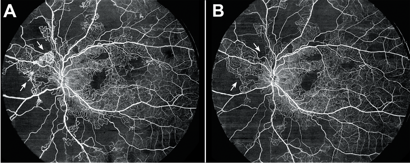 Figure 4. (A) Optical coherence tomography angiography of a 40-year-old female with a history of proliferative diabetic retinopathy demonstrating capillary nonperfusion and peripapillary neovascularization elsewhere (arrows). (B) Optical coherence tomography angiography one year after treatment with intravitreal bevacizumab demonstrating regression of the neovascularization (arrows). |