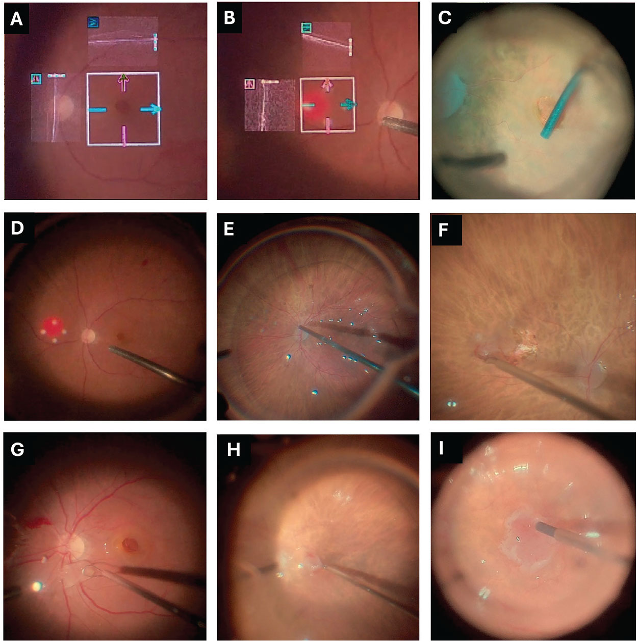 | Figure 1. (A) Intraoperative images demonstrating initial measurement of the macular hole with intraoperative-OCT, (B) followed by measurement of the graft with iOCT. (C) Next, viscodissection of the MH borders is completed to create a space for insertion of the graft. (D) Laser markings are used as a guide for graft sizing, and (E) perfluorocarbon is placed anterior to the graft harvesting site. (F) The graft is obtained with microscissors and viscodissection and (G) transported to the MH site using a Flex Loop (H) and Maxgrip forceps (I), where it’s positioned at the borders of the graft underneath the edges of the MH with the Maeno-Awh Super Manipulator. |