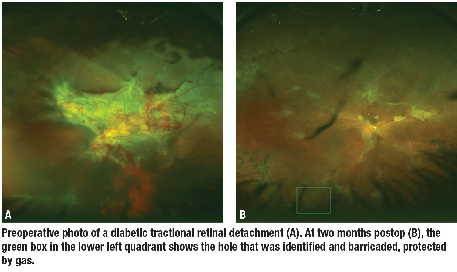 In one recent patient, we noted a new hole at postop week three as the C3F8 bubble was shrinking. The hole was located within the detached area and eluded notice intraoperatively. In this case, thankfully, the gas and positioning served to tamponade the new hole while subretinal fluid was reabsorbed in that area postoperatively. This helped to prevent any subretinal fluid around this inferior break which was subsequently easily barricaded in the office (Figure B, page 15). RS