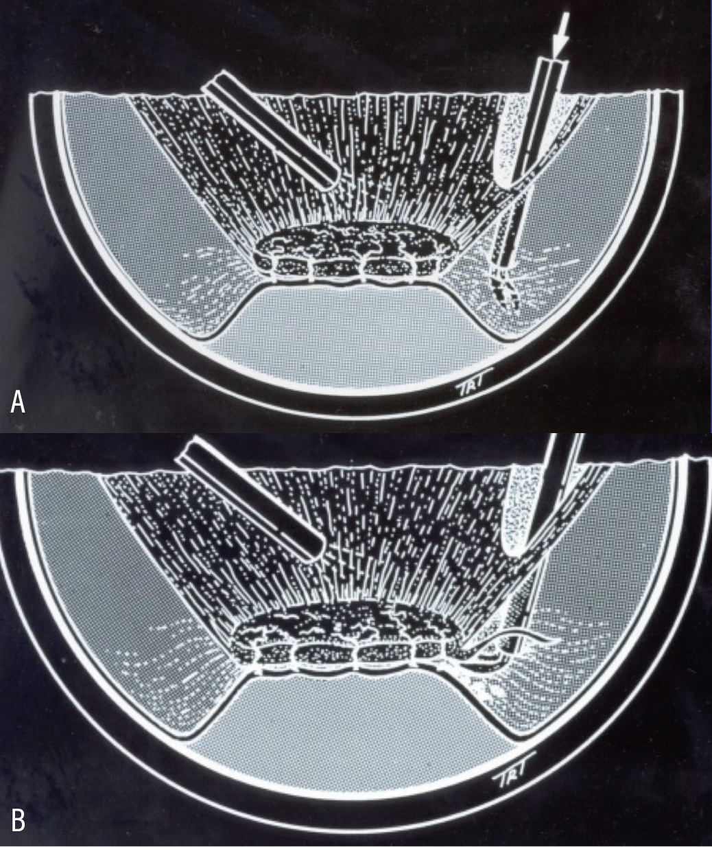 The configuration of diabetic TRD can range from a “tabletop” detachment where the entire area of detachment is elevated evenly like a table with the legs representing the fibrovascular pegs to a very uneven “mountain range” configuration where detached retina is unevenly elevated above both discrete and broad areas of vitreoretinal adhesion. Preoperative evaluation and mapping with examination and imaging are critical when planning for this type of approach. Traditionally, the delamination technique is thought to create a more complete relief of traction but carries with it a higher risk of retinal breaks. Once a break is encountered, all associated traction must be relieved. Residual traction, even with a break that has been lasered, typically yields recurrent RD. Residual subretinal fluid in the absence of retinal breaks doesn’t need to be drained.12