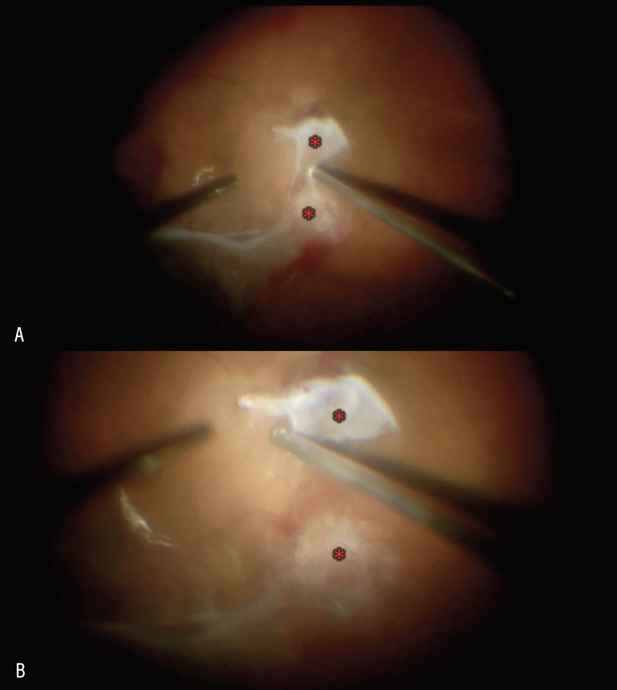 | Figure 2. Segmentation of two adjacent areas of proliferation (red asterisk) using the vitreous cutter positioned in the vitreoretinal interface (A). Two islands of fibrovascular proliferation (red asterisk) following segmentation (B). |