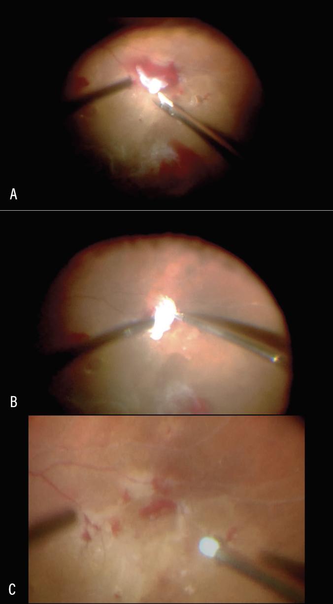 | Figure 3. Delamination of fibrovascular membrane using horizontal scissors (A). Sharp dissection under fibrovascular proliferation to cut the vascular peg (B). Delamination complete. Residual hemorrhage removed with soft tip cannula (C). |