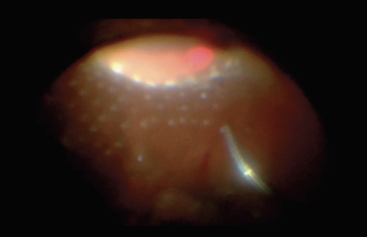 | Figure 4. Anterior panretinal photocoagulation applied with the assistance of scleral depression. |