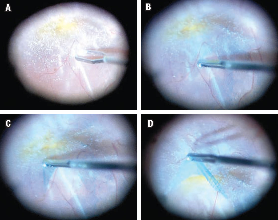 When you encounter difficulty in initiating the flap, you can apply membrane stains to improve your visualization. Triamcinolone, while not exactly a stain, can be used to highlight the surface of the membrane and any elevated ridges as the microparticles settle and adhere to the surface of the membrane.