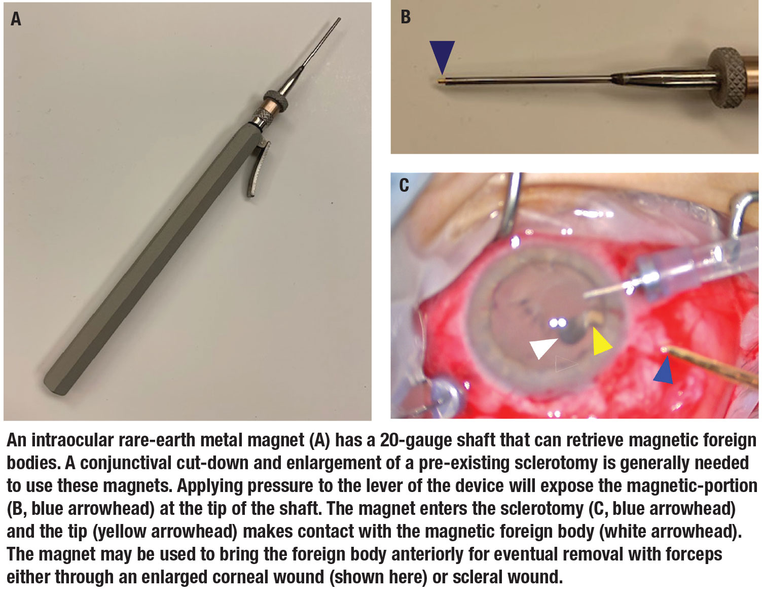 Both internal and external magnets can be helpful in extracting magnetic foreign bodies. An internal magnet is a rare-earth magnet that attracts ferro-magnetic objects towards its typically 20-gauge shaft. To introduce the internal magnet, perform a conjunctival cut-down and use a 20-gauge micro-vitreoretinal blade to create or enlarge a sclerotomy.