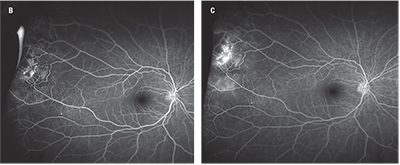 ![]() Figure 1. Fundus photography of an 11-year-old patient with Coats’ disease reveals temporal exudation and telangiectasias (A). Fluorescein angiography reveals light-bulb telangiectasias (B at 1 minute, 23 seconds; C at 5 minutes, 18 seconds). |