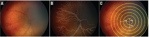 | Figure 2. The i-ROP computer-based image analysis system has demonstrated efficacy in diagnosis of plus vs. no plus disease and plus vs. pre-plus vs. no plus disease from fundus photos (A) through an algorithm that calculates acceleration of all vessels (B) in a circular cropped image with radius of 6 disc diameters (C). |