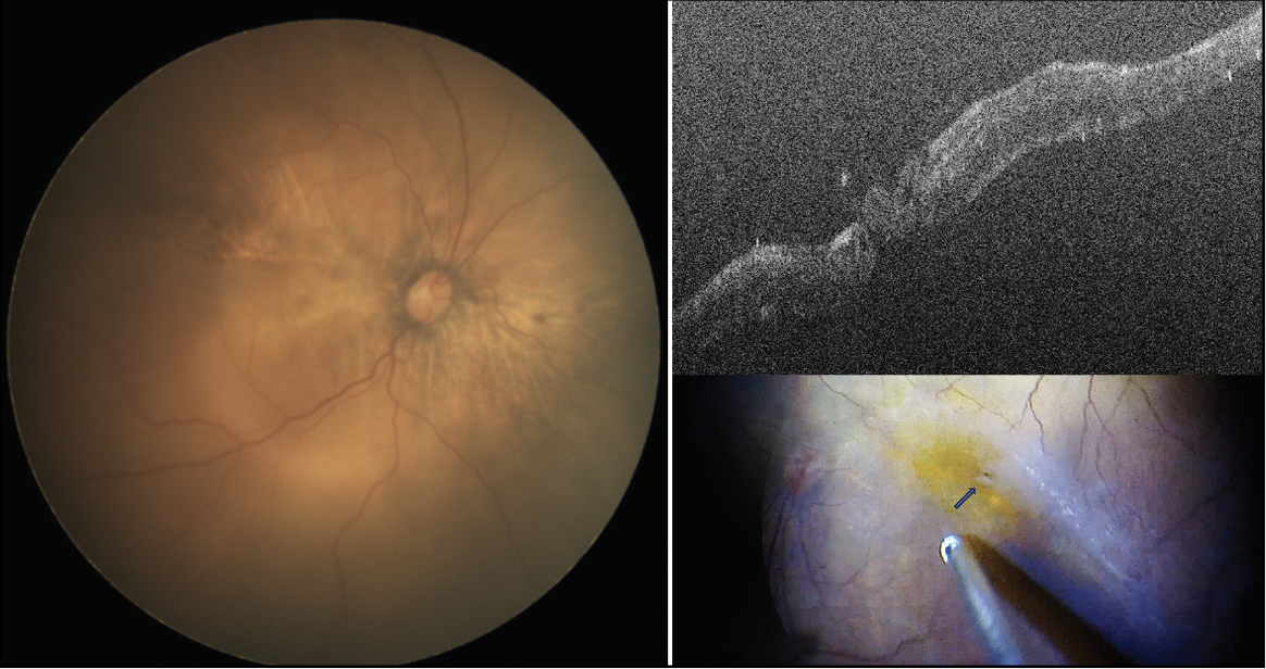 | Figure 1. An infant with Knobloch syndrome, associated with COL18A1 mutation, presenting with shallow RD in a myopic fundus without apparent retinal break on examination. OCT reveals macular hole-related RD, which becomes apparent with the vitreous suction during surgery (arrow). |