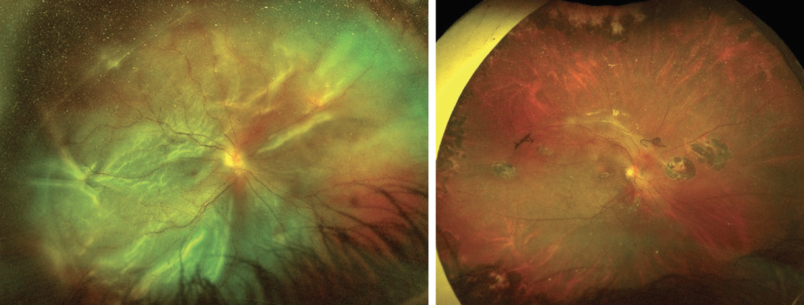 | Figure 2. A total rhegmatogenous retinal detachment in a 14-year-old male with a history of penetrating trauma at age 2 who presented with superior retinal dialysis, multiple retinal tears in all quadrants and associated proliferative vitreoretinopathy (left). Surgical management included membrane removal and adjunctive mitomycin-C application to prevent recurrence. The retina remained attached with no evidence of recurrent proliferation at two-year follow-up (right). |