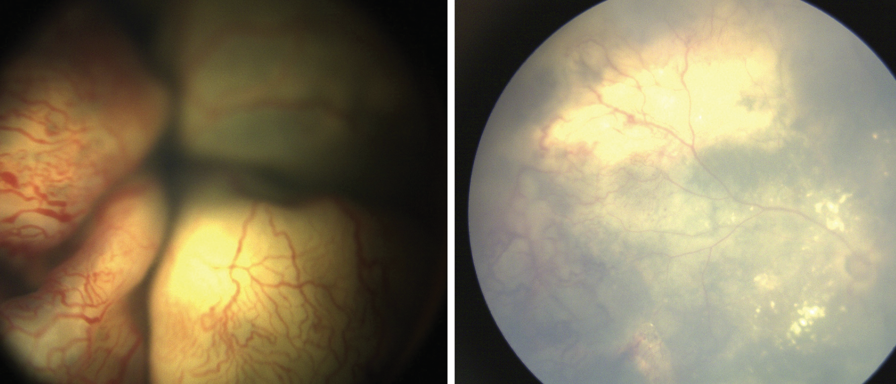 | Figure 4. Coats’ disease showing bullous exudative retinal detachment with engorged vessels and telangiectasias in an 18-month-old female (left). Ultrasound showed no mass lesion or calcification. Surgery with external drainage combined with vitrectomy, endolaser and cryotherapy, and anti-VEGF injection resulted in retinal reattachment (right). |