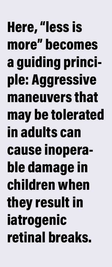 Pediatric cases often have different goals—such as halting progression, making the anatomy less abnormal or simply preserving the globe or maintaining light perception. Here, “less is more” becomes a guiding principle: Aggressive maneuvers that may be tolerated in adults can cause inoperable damage in children when they result in iatrogenic retinal breaks.