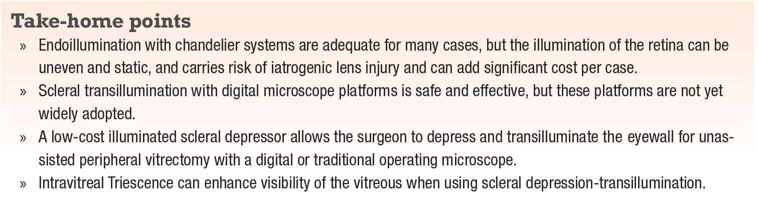 For many of us in private practice, where trainee surgeons aren’t readily available, the options include training scrub technicians to perform scleral depression or using an endoilluminating chandelier system. But while both of these approaches can be effective, each has its unique challenges and drawbacks.