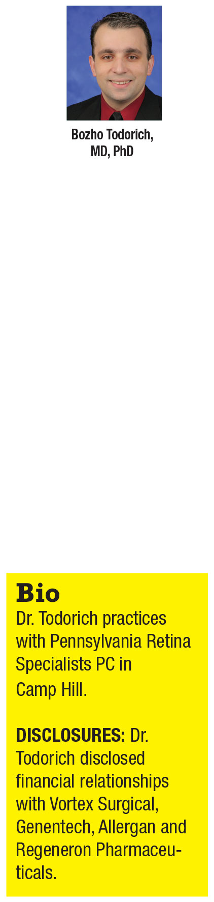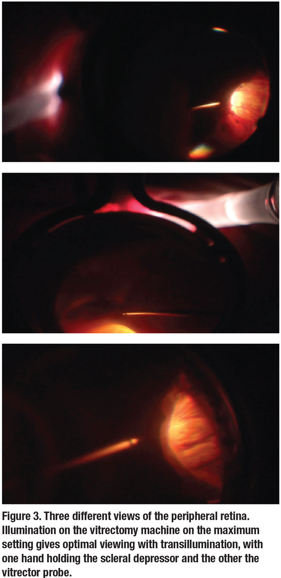 With this technique, the anatomy of the retina, retinal pigment epithelium and choroid is well-visualized, allowing for detection of even small retinal breaks. Like any new technique, there’s a learning curve of approximately five to 10 cases to get the “feel” for it and gain comfort with a view that’s different from traditional endoillumination. The view is best in thin-walled, blonde, myopic Caucasian eyes, but can be challenging in highly pigmented fundi.