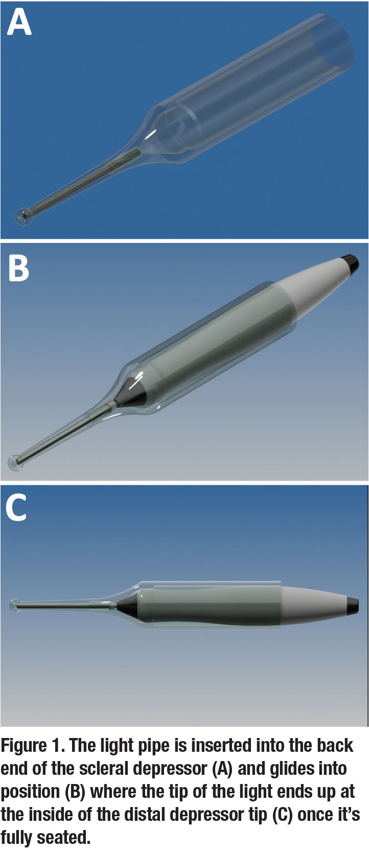 The device is made of inert polycarbonate molded into the shape of a traditional ball-point depressor. Its stiffness and feel approach that of a regular scleral depressor. To further enhance its stiffness and reduce light backscatter and glare, the shaft of the depressor is fortified with a 19-ga. hypodermic needle.
