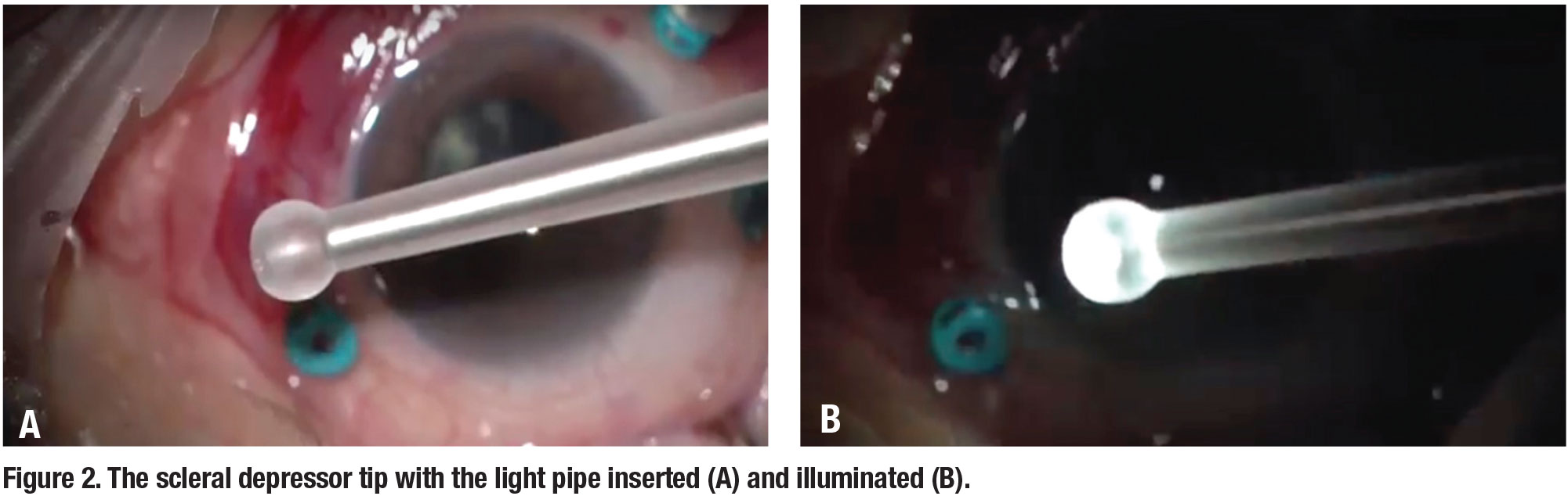 The light pipe is inserted into the a back end and glides into position where the tip of the light ends up at the inside of the distal depressor tip once it’s fully seated (Figures 1 and 2). For optimal viewing, the illumination on the vitrectomy machine is adjusted to the maximum setting. The depressor tip is machined to achieve maximum optical clarity while its polished ball tip glides seamlessly along the scleral surface, even for patients with tighter orbits. The surgeon performs unassisted vitrectomy with one hand while depressing and transilluminating simultaneously with the other (Video). The device I use is produced and marketed by Vortex Surgical. While the Vortex surgical device is designed to be used with the Alcon system, similar devices are available for other platforms, such as the DORC Eva system.