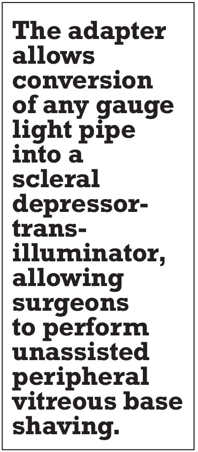 Considering that digital microscope platforms like NGenuity are still not widely available, particularly at community-based retina practices, we designed a device adapter for endoillumination light pipe that would allow conversion of any gauge light pipe into a scleral depressor-transilluminator and allow it to be used with any analogue operating microscope (Figure 1, page 21).