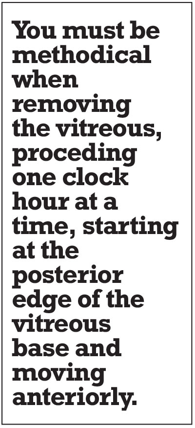 You must be methodical when removing the vitreous, doing it one clock hour at a time, starting at the posterior edge of the vitreous base and moving anteriorly, ensuring complete vitreous removal before moving to the adjacent clock hour. This will ensure complete peripheral vitrectomy without skipping any areas, particularly in cases such as retinal detachment repair.