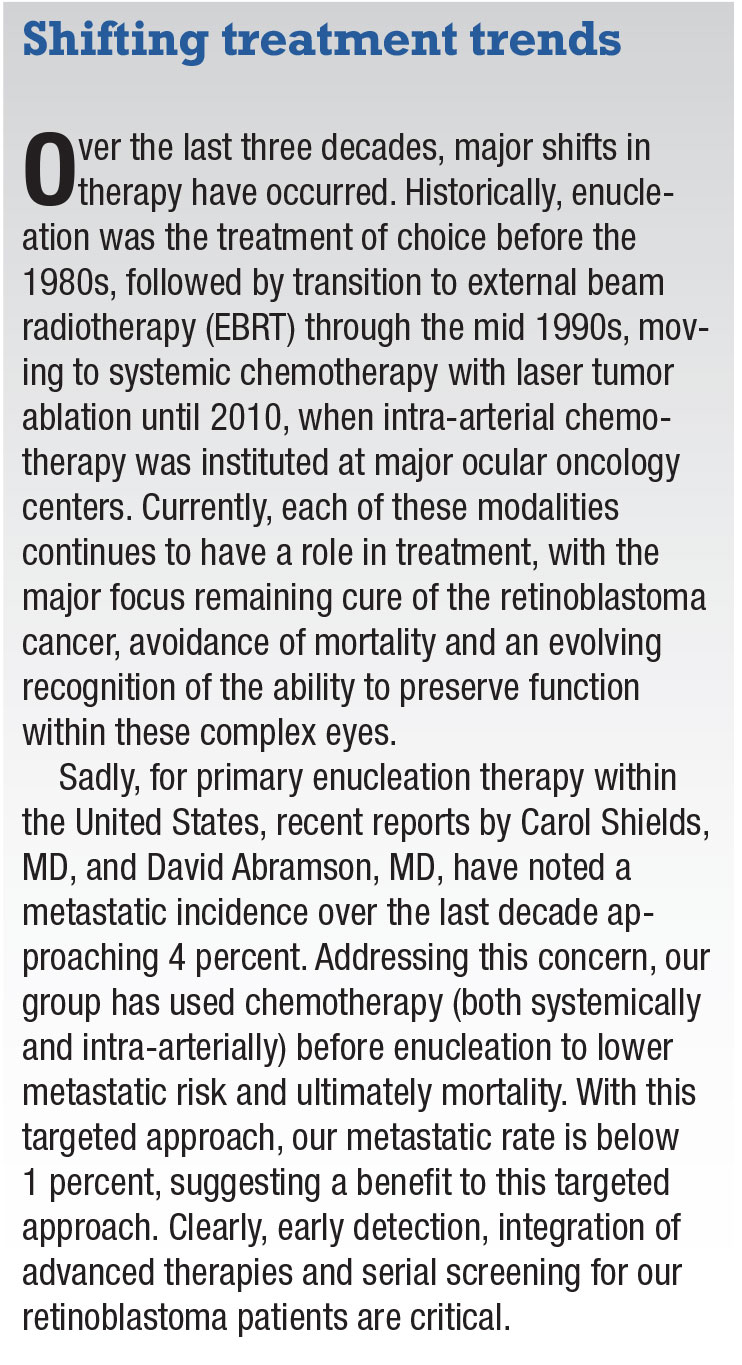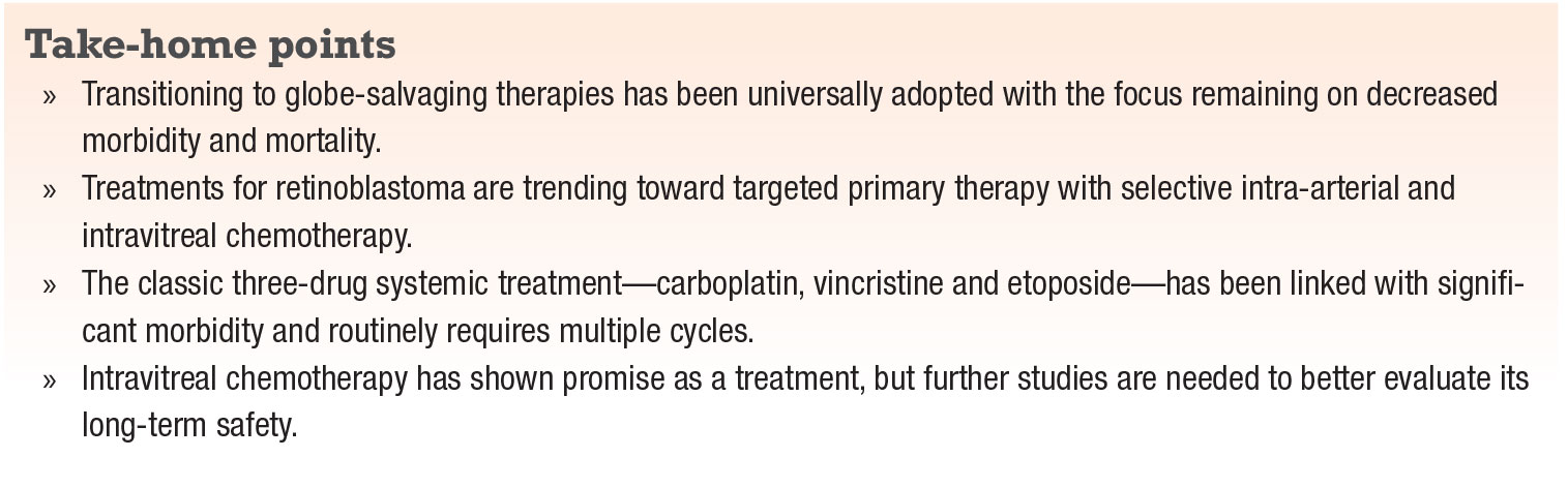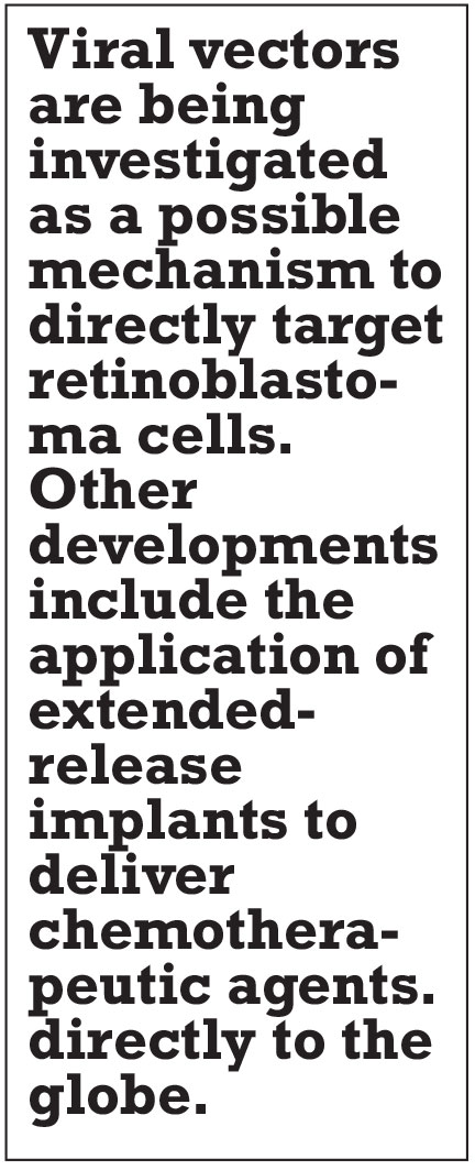 The classic three-drug systemic treatment (carboplatin, vincristine and etoposide) has been associated with significant morbidity, and it routinely requires multiple cycles. Bone marrow suppression, ototoxicity, nephrotoxicity and risk of induction of secondary cancers have been reported.6-7 Controversy continues to surround the role of systemic chemotherapy in the prevention of trilateral RB.8-9 The combination of systemic and/or intra-arterial chemotherapy with focal ablative treatments has been shown to have better globe salvage rates than chemotherapy alone in both early and advanced RB.10-13