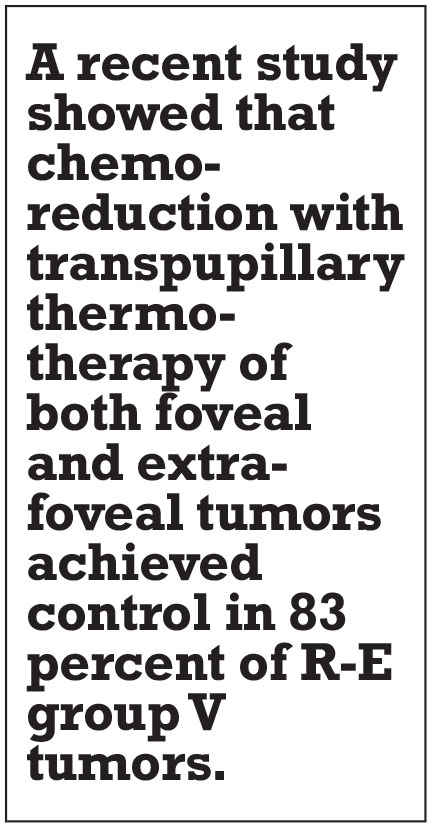 A recent study on macular retinoblastoma outcomes showed that chemoreduction with transpupillary thermotherapy of both foveal and extrafoveal tumors achieve control in 83 percent of R-E group V tumors.14 All tumors less than R-E group V achieved 100-percent control. Despite ablative foveal laser treatment, 56 percent of eyes had better than 20/80 visual acuity.