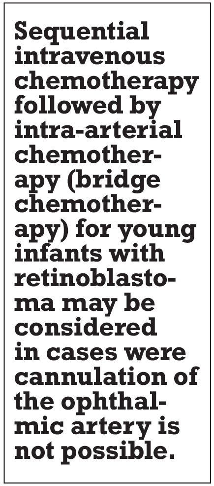 Sequential intravenous chemotherapy followed by intra-arterial chemotherapy (bridge chemotherapy) for young infants with retinoblastoma may be considered when cannulation of the ophthalmic artery isn’t possible.26 Further studies will elucidate the optimal timing for bridging.