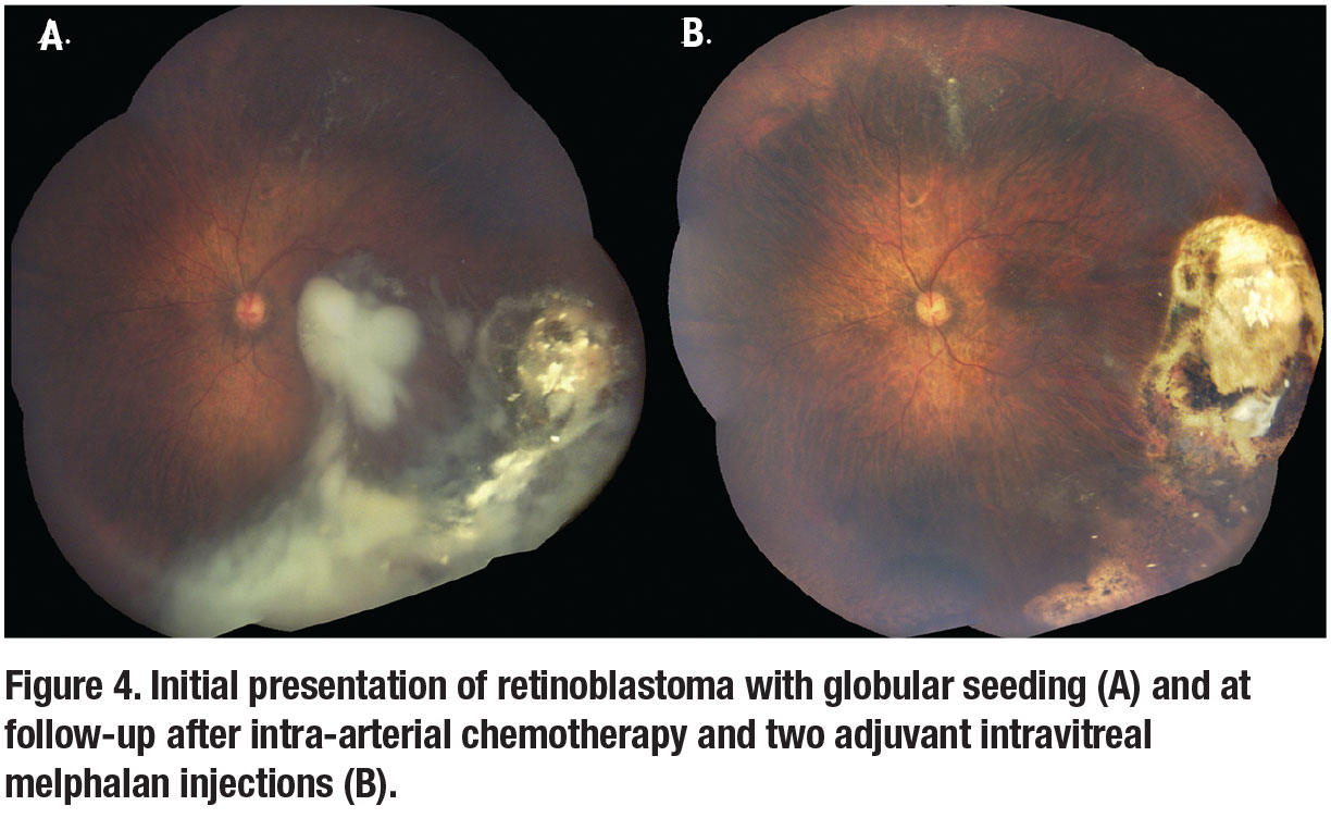 A recent bi-institutional cohort study evaluated the vitreous seed response after 475 intravitreal melphalan injections.28 The study included 87 eyes treated weekly (median dose, 30 µg) with a median of five treatments per eye (range, one to 12 times). The two-year Kaplan-Meier estimates for ocular survival and patient survival were 90.4 percent and 100 percent, respectively. Other authors have also reported on the efficacy of intravitreal melphalan for the treatment of RB (Figure 4).29-31
