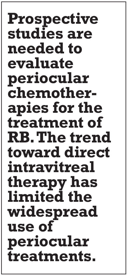 Prospective studies are needed to assess the role of periocular chemotherapies for the treatment of RB. Nevertheless, the trend toward direct intravitreal therapy has limited the widespread use of periocular treatments.