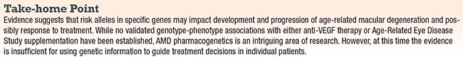 In summary, AMD pharmacogenetics is an intriguing area of research, but at this time there is insufficient evidence to use genetic information to guide treatment decisions in individual patients. RS