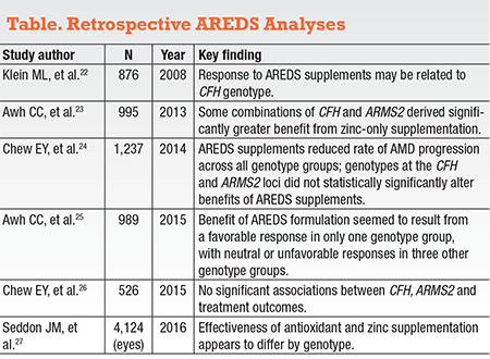 AMD is a complex genetic disease, with both genetic and environmental influences, so analysis of only two risk alleles (CFH and ARMS2) may yield misleading information.28 No randomized clinical trials have been published regarding genotype-phenotype relationships with AREDS supplementation.