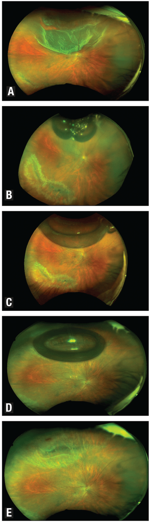 | Wide-field retinal images demonstrate outcomes of a phakic patient meeting PIVOT criteria. With a superior macula-off retinal detachment (A), the patient underwent laser retinopexy for inferior lattice pre-pneumatic retinopexy. At two hours post-pneumatic retinopexy with patient positioning face down, significantly less fluid is seen and some fluid is displaced nasally (B). At 15 hours post-pneumatic retinopexy, the retina is fully attached with coalesced bubbles (C). The patient underwent laser for a superior break 48 hours post-pneumatic retinopexy, demonstrating fully attached retina and superior break lasered (D). At 10 days post-pneumatic retinopexy, following reabsorption of the gas bubble (E), the retina is fully attached with all |