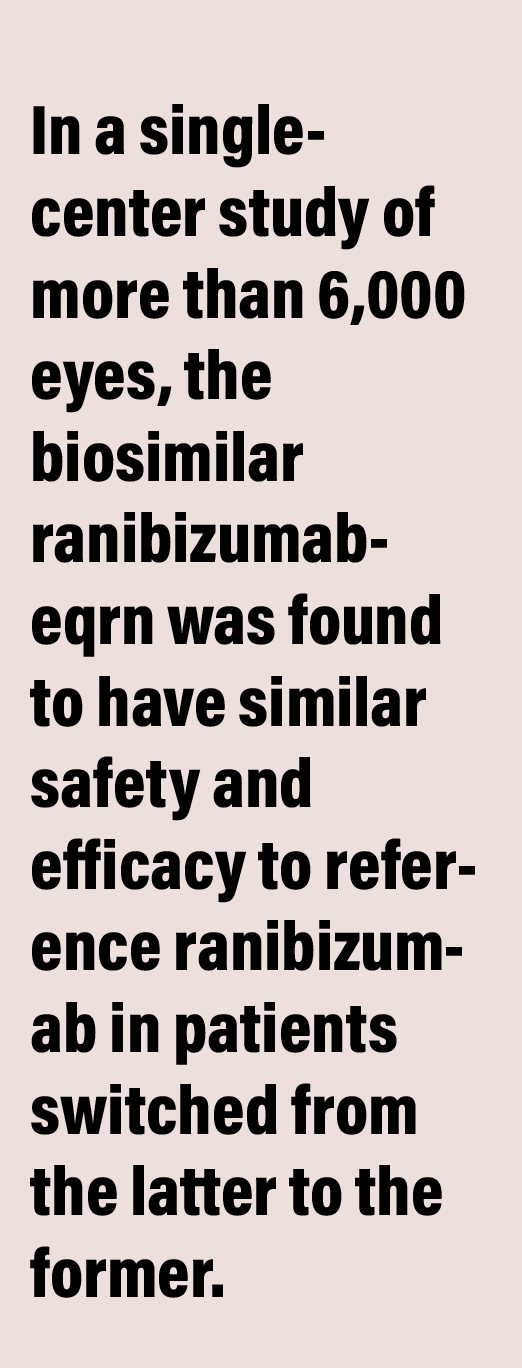 In a single-center study of more than 6,000 eyes, the biosimilar ranibizumab-eqrn (RZE) (Cimerli, Sandoz) was found to have similar safety and efficacy to reference ranibizumab (Lucentis, Genentech Roche) in patients who were switched from the latter to the former. This is the first switching study of ranibizumab from clinical practice.5