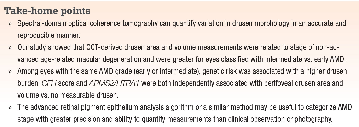 Our studies and others’ have shown that OCT-derived drusen area and volume and retinal features, such as hyper-reflective foci and choroidal parameters, may aid in determining the likelihood of progression from early or intermediate to advanced AMD.5-10