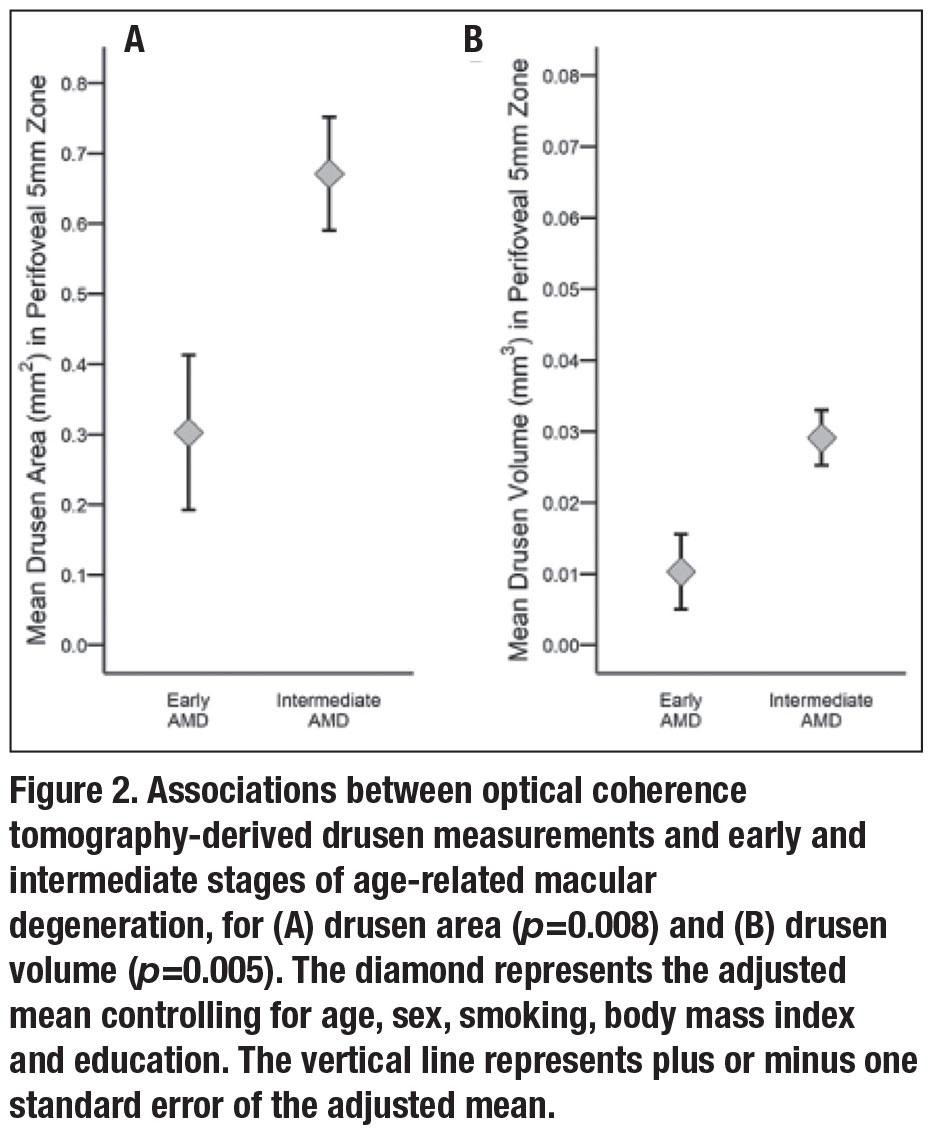 • Association between OCT drusen measurements and AMD grade. Mean OCT-derived drusen area was significantly associated with AMD grade based on color photographs and was higher in intermediate vs. early AMD eyes after adjustments for age, sex, smoking, BMI and education (p=0.008) (Figure 2A). Similarly, mean drusen volume was greater in intermediate vs. early AMD (p=0.005) (Figure 2B).