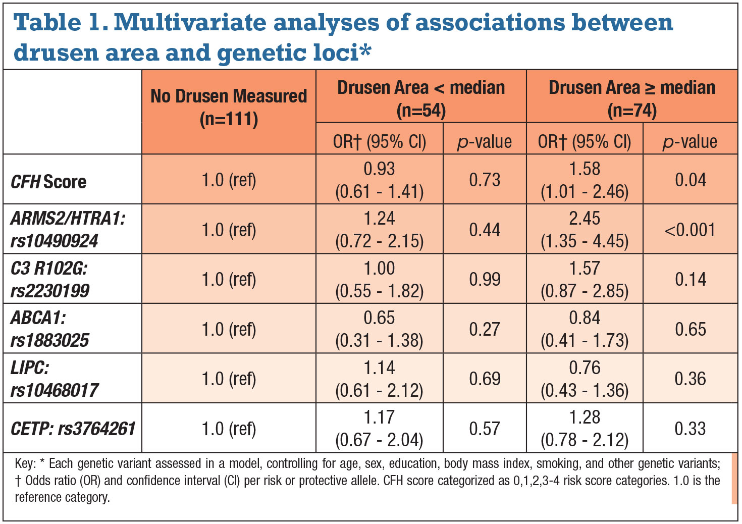 • Associations between drusen measurements and AMD genetic variants. A higher CFH score (combining two CFH variants) was associated with greater drusen area in the perifoveal 5-mm zone controlling for age, sex, smoking, BMI and education (Table 1). Drusen area greater than median vs. no measurable drusen increased per category of CFH score. Risk for greater drusen area increased 1.6 times for each genetic score category, and risk for greater drusen burden with three or more risk alleles in CFH score was fivefold higher. Drusen volume yielded similar results.