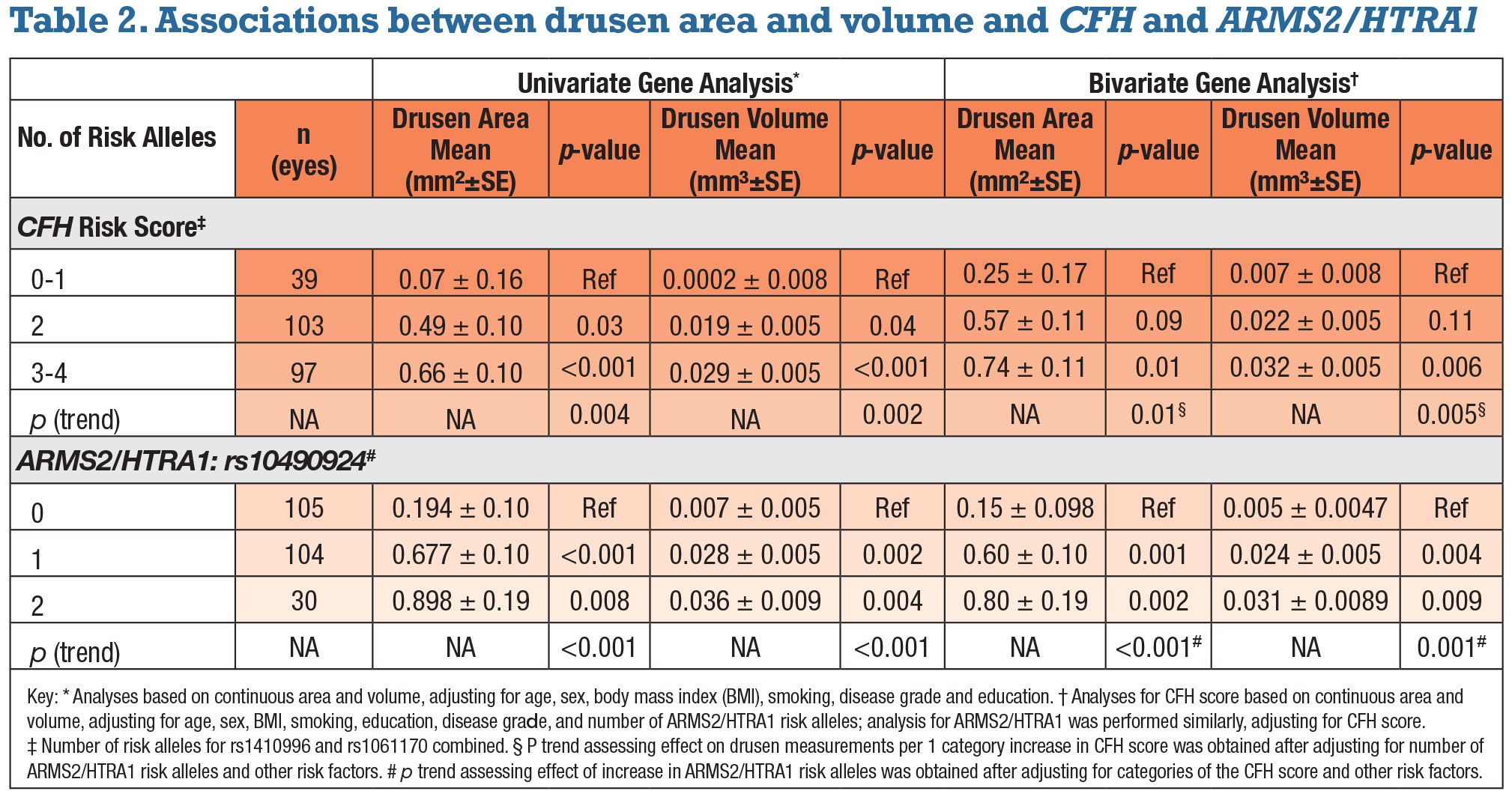 When both genes were adjusted for each other (bivariate analyses), the associations between drusen measurements and CFH score were somewhat reduced. However, the trend for higher drusen area and volume with a higher score remained significant (p=0.01 and 0.005, respectively).